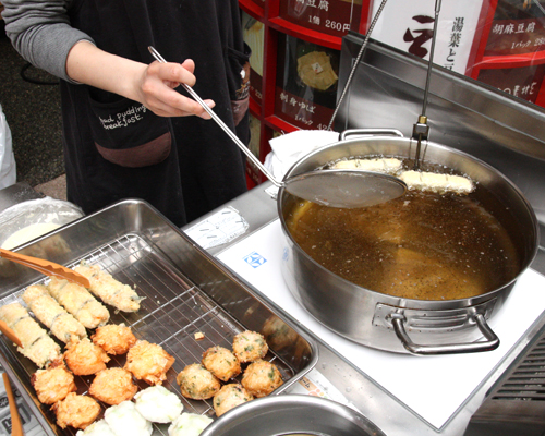 豆房では、水曜日の10:00~13:00の間にはお店の前にて揚げ物を水曜日以外の同時間帯には湯葉の実演と販売を致しております。
